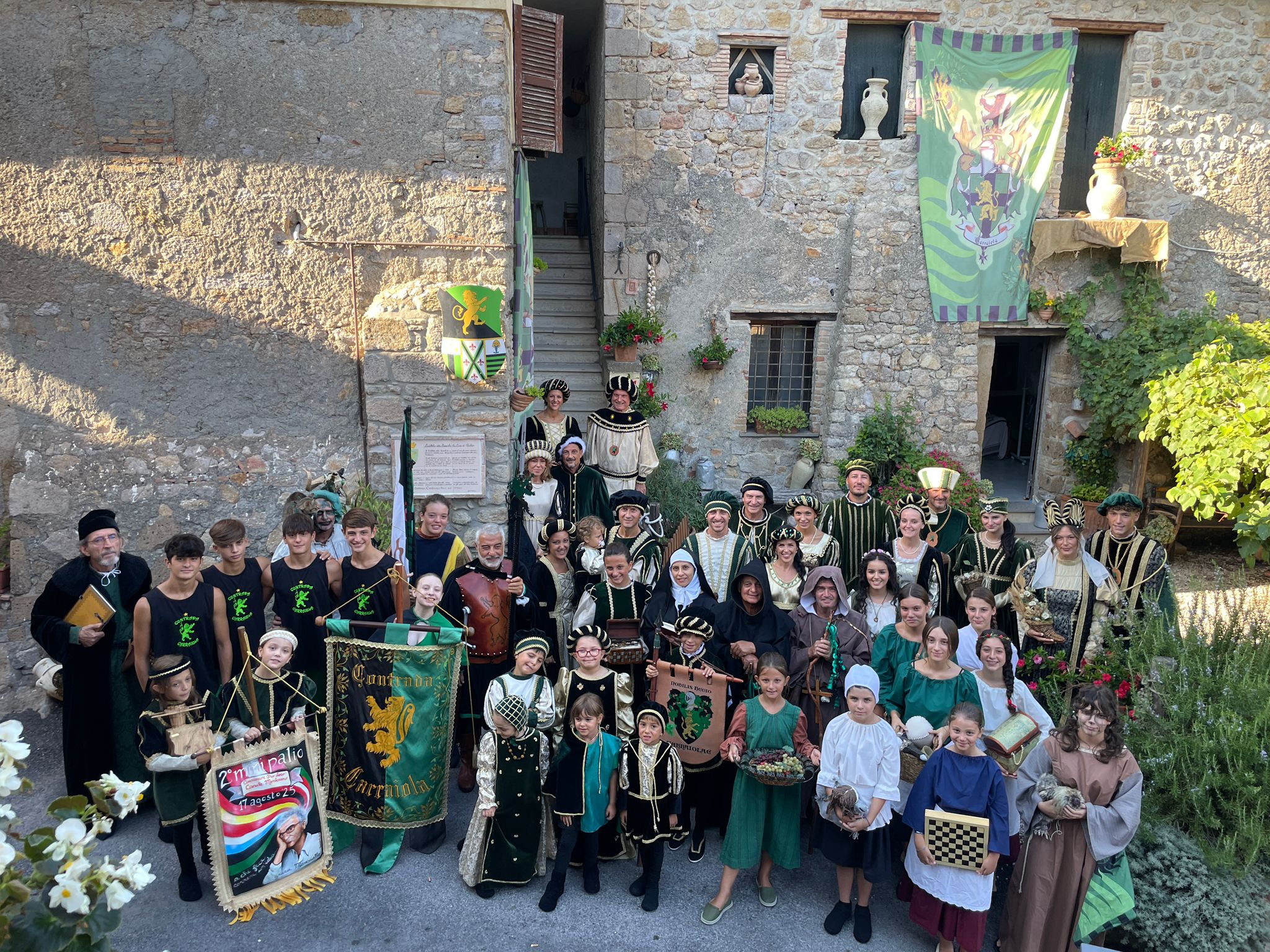 Il corteo della Nobile Contrada Carraiola è aperto dal gonfalone dove è possibile ammirare lo stemma, il leone rampante, e i colori, il verde e il nero.