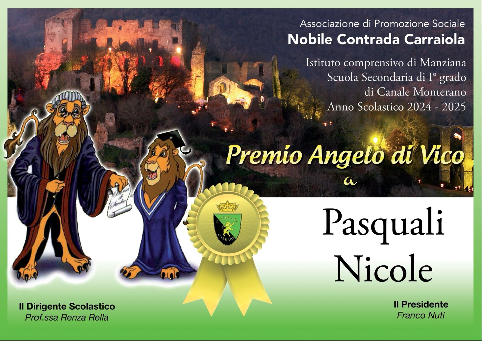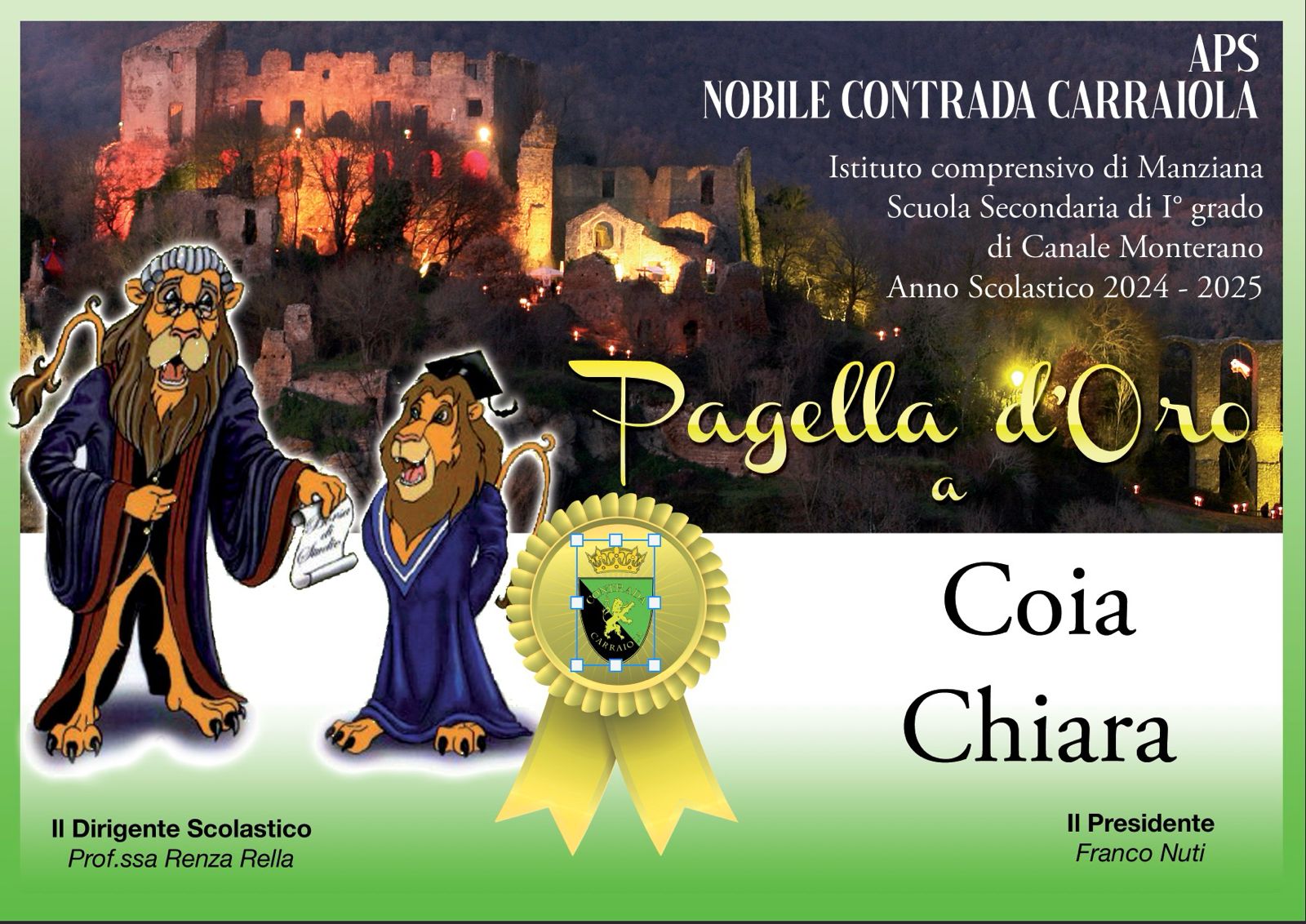 Grazie ad Anna per tener sempre vivo il ricordo del nostro amico e contradaiolo Angelo, grazie ai docenti della scuola media di Canale, all'amm.ne comunale e soprattutto grazie alle nostre ragazze Federica ed Eleonora per aver presieduto alla consegna dei premi.